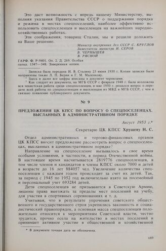 Предложения ЦК КПСС по вопросу о спецпоселенцах, высланных в административном порядке. Август 1953 г. // ГАРФ. Ф. Р-9479. Оп. 1. Д. 612. Л. 69-72. Копия.