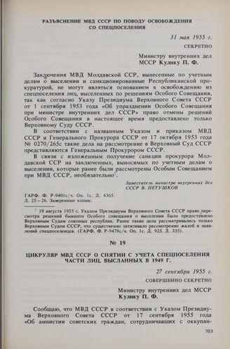 Разъяснение МВД МССР по поводу освобождения со спецпоселения. 31 мая 1955 г. // ГАРФ. Ф. Р-9401с/ч. Оп. 1с. Д. 4365. Л. 25-26. Заверенные копии.