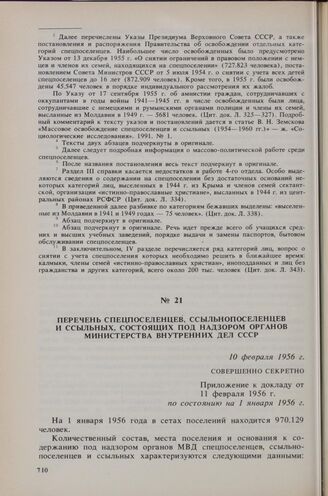 Перечень спецпоселенцев, ссыльнопоселенцев и ссыльных, состоящих под надзором органов Министерства внутренних дел СССР по состоянию на 1 января 1956 г. 10 февраля 1956 г. // ГАРФ. Ф. Р-9479 с/ч. Оп. 1с. Д. 925. Л. 345-348.
