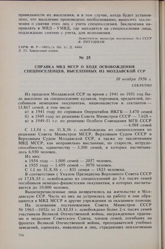 Справка МВД МССР о ходе освобождения спецпоселенцев, выселенных из Молдавской ССР. 10 ноября 1956 г. // ГАРФ. Ф. Р-9479с/ч. Оп. 1с. Д. 925. Л. 53-53об. Подлинник.
