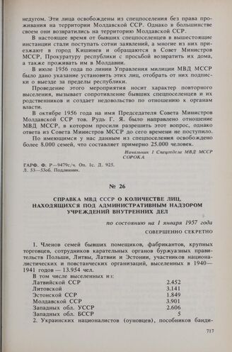 Справка МВД СССР о количестве лиц, находящихся под административным надзором учреждений внутренних дел по состоянию на 1 января 1957 года // ГАРФ. Ф. Р-9479с/ч. Оп. 1с. Д. 925. Л. 62-64. Копия.
