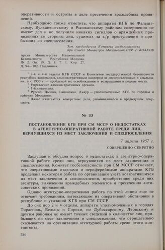 Постановление КГБ при СМ МССР о недостатках в агентурно-оперативной работе среди лиц, вернувшихся из мест заключения и спецпоселения. 7 апреля 1957 г. // Архив Министерства Национальной Безопасности Республики Молдова. Ф. 2. Оп. 19. Д. 8. Т. 1. Кор. 27. Л. 91-93. Заверенная копия.