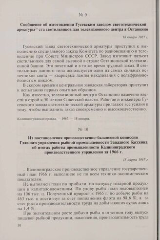 Сообщение об изготовлении Гусевским заводом светотехнической арматуры ста светильников для телевизионного центра в Останкино. 18 января 1967 г. // Калининградская правда. — 1967. — 18 января.