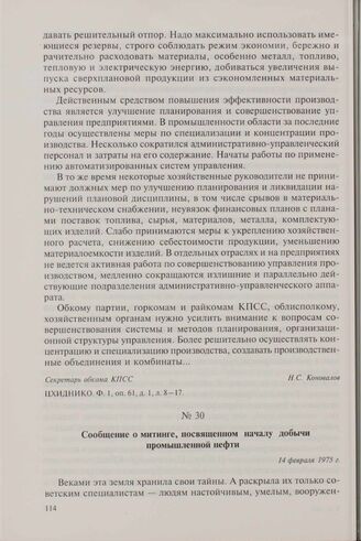 Сообщение о митинге, посвященном началу добычи промышленной нефти. 14 февраля 1975 г.