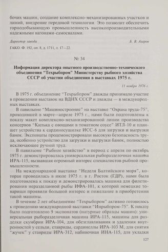Информация директора опытного производственно-технического объединения «Техрыбпром» Министерству рыбного хозяйства СССР об участии объединения в выставках 1975 г. 11 ноября 1976 г.