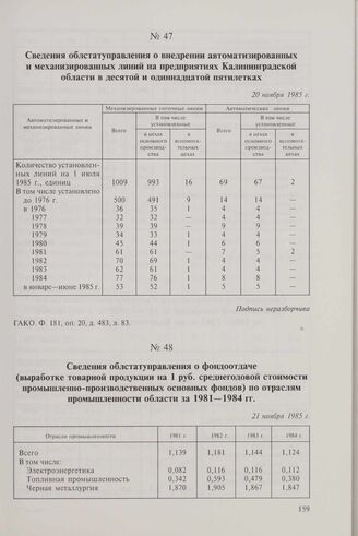 Сведения облстатуправления о внедрении автоматизированных и механизированных линий на предприятиях Калининградской области в десятой и одиннадцатой пятилетках. 20 ноября 1985 г. // ГАКО. Ф. 181, оп. 20, д. 483, л. 83.