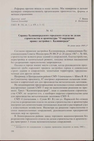 Справка Калининградского городского отдела по делам строительства и архитектуры «О нарушении правил застройки г. Калининграда». Не ранее июля 1969 г. // ГАКО. Ф. 522, оп. 1, д. 185, л. 25-27.