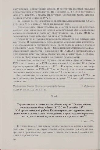 Справка отдела строительства обкома партии «О выполнении постановления бюро обкома КПСС от 2 декабря 1971 г. «Об организаторской работе Калининградского территориального управления строительства по внедрению в производство передового опыта, достижений науки и техники в строительстве». 21 мая 1973 г. // ЦХИДНИКО. Ф. 1, оп. 79, д. 70, л. 9-13.