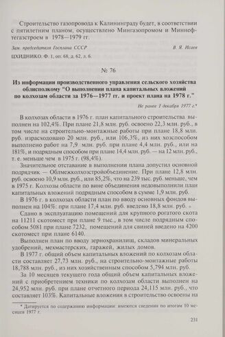 Из информации производственного управления сельского хозяйства облисполкому «О выполнении плана капитальных вложений по колхозам области за 1976-1977 гг. и проект плана на 1978 г.». Не ранее 1 декабря 1977 г.