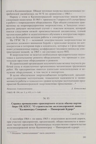 Справка промышленно-транспортного отдела обкома партии бюро ОК КПСС «О строительстве железнодорожной линии «Калининград Северный — Пионерский Курорт». 5 августа 1966 г.