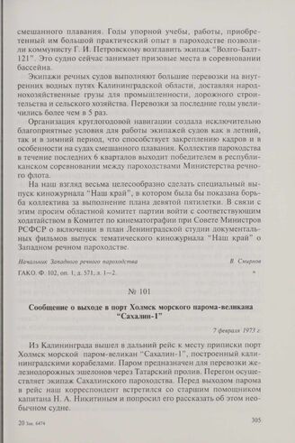 Сообщение о выходе в порт Холмск морского парома-великана «Сахалин-1». 7 февраля 1973 г. // Калининградская правда. — 1973 г. — 7 февраля.
