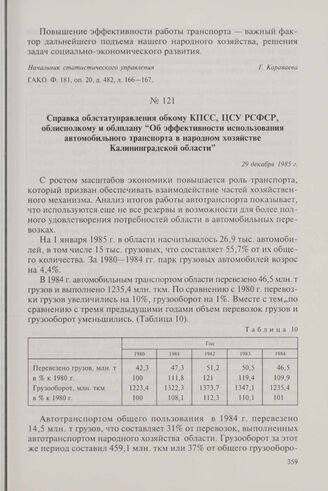 Справка облстатуправления обкому КПСС, ЦСУ РСФСР, облисполкому и облплану «Об эффективности использования автомобильного транспорта в народном хозяйстве Калининградской области». 29 декабря 1985 г. // ГАКО. Ф. 181, оп. 20, д. 483, л. 165-170.