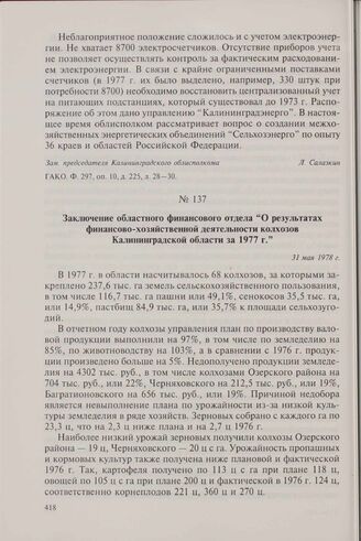 Заключение областного финансового отдела «О результатах финансово-хозяйственной деятельности колхозов Калининградской области за 1977 г.». 31 мая 1978 г. // ГАКО. Ф. 139, оп. 11, д. 157, л. 65-70.