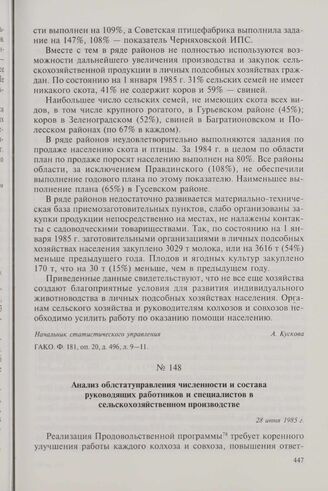 Анализ облстатуправления численности и состава руководящих работников и специалистов в сельскохозяйственном производстве. 28 июня 1985 г. // ГАКО. Ф. 181, оп. 20, д. 484, л. 90-100.