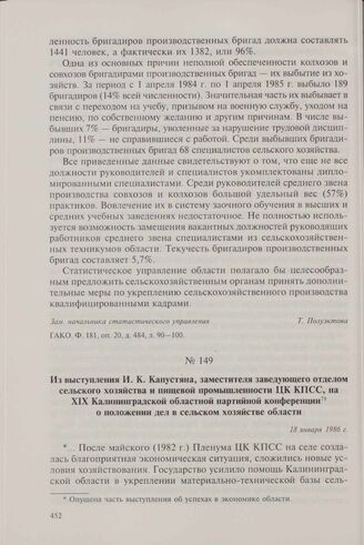 Из выступления И.К. Капустяна, заместителя заведующего отделом сельского хозяйства и пищевой промышленности ЦК КПСС, на XIX Калининградской областной партийной конференции о положении дел в сельском хозяйстве области. 18 января 1986 г. // ЦХИДНИКО. Ф. 1, оп. 94, д. 1, л. 148-161.