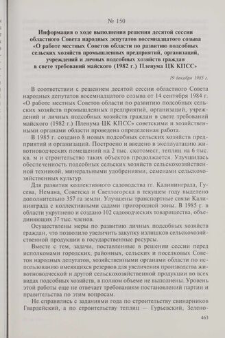 Информация о ходе выполнения решения десятой сессии областного Совета народных депутатов восемнадцатого созыва «О работе местных Советов области по развитию подсобных сельских хозяйств промышленных предприятий, организаций, учреждений и личных подсобных хозяйств граждан в свете требований майского (1982 г.) Пленума ЦК КПСС». 19 декабря 1985 г. // ГАКО. Ф. 297, оп. 10, д. 908, л. 14-16.