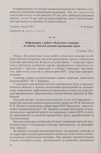 Информация о работе областного семинара по обмену опытом научной организации труда. 4 сентября 1968 г.