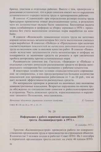 Информация о работе первичной организации НТО треста «Калининградстрой» в 1971 г. 16 сентября 1971 г. // ГАКО. Ф. 21, оп. 1, д. 492, л. 6-8.