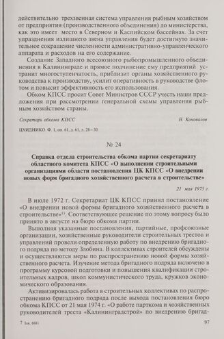 Справка отдела строительства обкома партии секретариату областного комитета КПСС «О выполнении строительными организациями области постановления ЦК КПСС «О внедрении новых форм бригадного хозяйственного расчета в строительстве». 21 мая 1975 г.