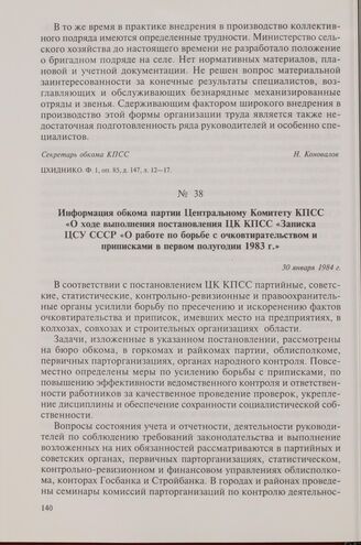 Информация обкома партии Центральному Комитету КПСС «О ходе выполнения постановления ЦК КПСС «Записка ЦСУ СССР «О работе по борьбе с очковтирательством и приписками в первом полугодии 1983 г.». 30 января 1984 г.