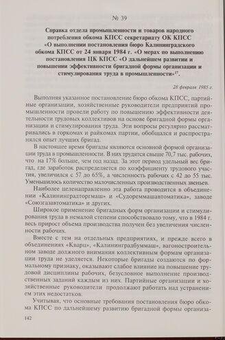 Справка отдела промышленности и товаров народного потребления обкома КПСС секретариату ОК КПСС «О выполнении постановления бюро Калининградского обкома КПСС от 24 января 1984 г. «О мерах по выполнен постановления ЦК КПСС «О дальнейшем развитии и п...