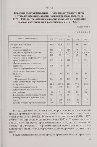 Сведения облстатуправления «О производительности труда в отраслях промышленности Калининградской области за 1976-1980 гг. (без промышленности колхозов) по выработке валовой продукции на 1 работающего в % к 1975 г.». 3 июля 1985 г.