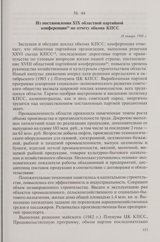 Из постановления XIX областной партийной конференции по отчету обкома КПСС. 18 января 1986 г. // ЦХИДНИКО. Ф. 1, оп. 94, д. 1, л. 164-172.