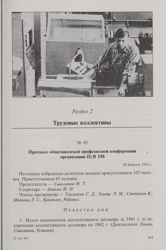 Протокол общезаводской профсоюзной конференции организации П/Я 198. 20 февраля 1962 г. // ГАКО. Ф. 28, оп. 1, д. 66, л. 9-13.