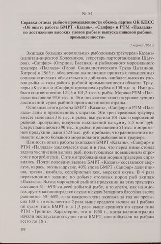 Справка отдела рыбной промышленности обкома партии ОК КПСС «Об опыте работы БМРТ «Казань», «Сапфир» и РТМ «Паллада» по достижению высоких уловов рыбы и выпуска пищевой рыбной промышленности». 3 марта 1966 г.
