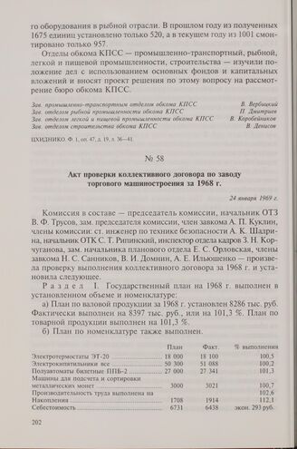 Акт проверки коллективного договора по заводу торгового машиностроения за 1968 г. 24 января 1969 г. // ГАКО. Ф. 97, оп. 1, д. 825, л. 1-8.