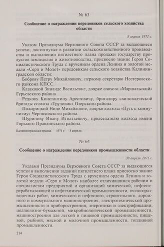 Сообщение о награждении передовиков промышленности области. 30 апреля 1971 г. // Калининградская правда. — 1971 г. — 30 апреля.