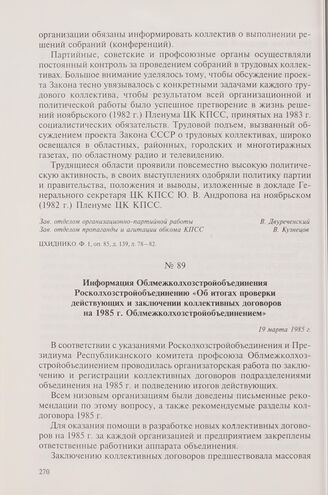 Информация Облмежколхозстройобъединения Росколхозстройобъединению «Об итогах проверки действующих и заключении коллективных договоров на 1985 г. Облмежколхозстройобъединением». 19 марта 1985 г.
