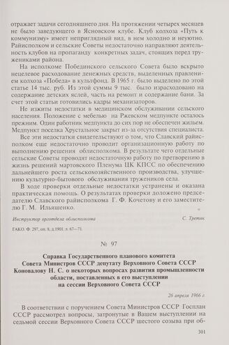 Справка Государственного планового комитета Совета Министров СССР депутату Верховного Совета СССР Коновалову Н.С. о некоторых вопросах развития промышленности области, поставленных в его выступлении на сессии Верховного Совета СССР. 26 апреля 1966 г.