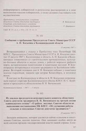 Сообщение о пребывании Председателя Совета Министров СССР А.Н. Косыгина в Калининградской области. 15 августа 1967 г.