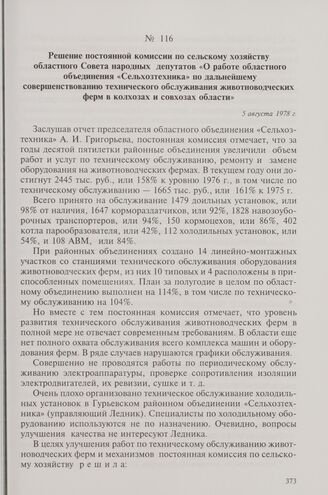 Решение постоянной комиссии по сельскому хозяйству областного Совета народных депутатов «О работе областного объединения «Сельхозтехника» по дальнейшему совершенствованию технического обслуживания животноводческих ферм в колхозах и совхозах области». 5 августа 1978 г. // ГАКО. Ф. 297, оп. 10, д. 90, л. 26-27.