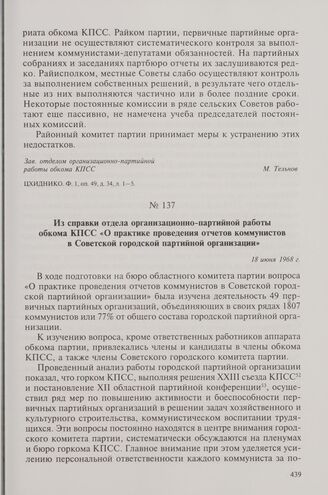 Из справки отдела организационно-партийной работы обкома КПСС «О практике проведения отчетов коммунистов в Советской городской партийной организации». 18 июня 1968 г.