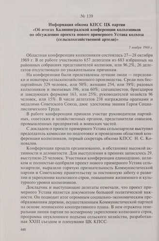 Информация обкома КПСС ЦК партии «Об итогах Калининградской конференции колхозников по обсуждению проекта нового примерного Устава колхоза (сельскохозяйственной артели)». 3 ноября 1969 г.