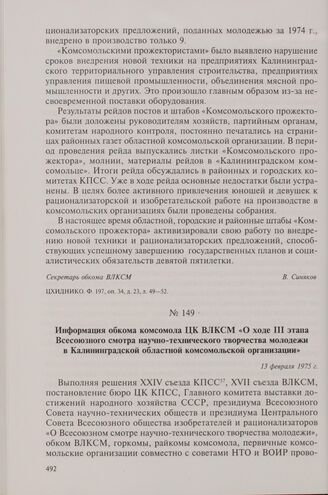 Информация обкома комсомола ЦК ВЛКСМ «О ходе III этапа Всесоюзного смотра научно-технического творчества молодежи в Калининградской областной комсомольской организации». 13 февраля 1975 г.