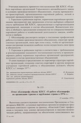 Отчет облсовпрофа обкому КПСС «О работе облсовпрофа по организации туризма в зарубежные страны в 1976 г.». 21 октября 1976 г.
