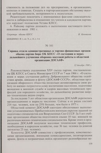 Справка отдела административных и торгово-финансовых органов обкома партии бюро ОК КПСС «О состоянии и мерах дальнейшего улучшения оборонно-массовой работы в областной организации ДОСААФ». 12 декабря 1980 г.