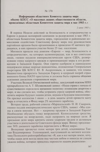 Информация областного Комитета защиты мира обкому КПСС «О массовых акциях общественности области, проведенных областным Комитетом защиты мира в мае 1983 г.». 2 июня 1983 г.