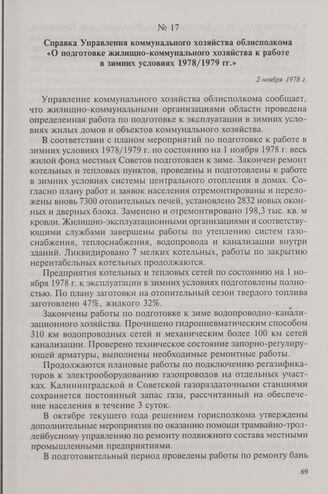 Справка Управления коммунального хозяйства облисполкома «О подготовке жилищно-коммунального хозяйства к работе в зимних условиях 1978/1979 гг.». 2 ноября 1978 г.