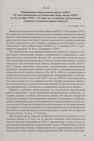 Информация облисполкома обкому КПСС «О ходе выполнения постановления бюро обкома КПСС от 24 октября 1978 г. «О мерах по улучшению эксплуатации и ремонта жилищного фонда области». 30 октября 1979 г.