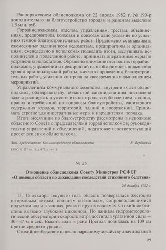 Отношение облисполкома Совету Министров РСФСР «О помощи области по ликвидации последствий стихийного бедствия». 20 декабря 1982 г. // ГАКО. Ф. 297, оп. 10, д. 672, л. 83.