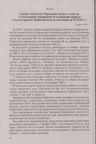 Справка областного Управления лесного хозяйства «О выполнении мероприятий по сохранению природы и благоустройству Куршской косы по состоянию на 01.03.83 г.». 1 марта 1983 г.