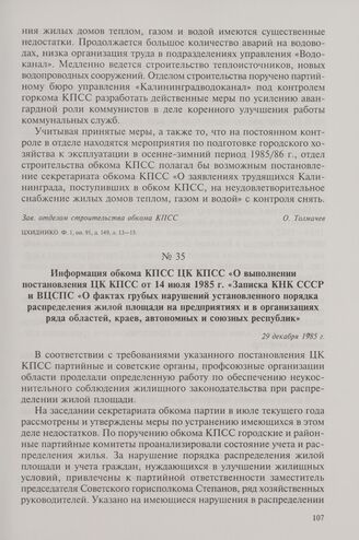 Информация обкома КПСС ЦК КПСС «О выполнении постановления ЦК КПСС от 14 июля 1985 г. «Записка КНК СССР и ВЦСПС «О фактах грубых нарушений установленного порядка распределения жилой площади на предприятиях и в организациях ряда областей, краев, автономных и союзных республик». 29 декабря 1985 г. // ЦХИДНИКО. Ф. 1, оп. 91, д. 185, л. 83-85.