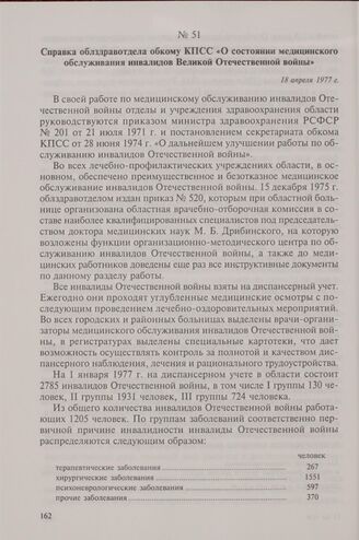 Справка облздравотдела обкому КПСС «О состоянии медицинского обслуживания инвалидов Великой Отечественной войны». 18 апреля 1977 г. // ЦХИДНИКО. Ф. 1, оп. 68. л. 113, л. 9-10.