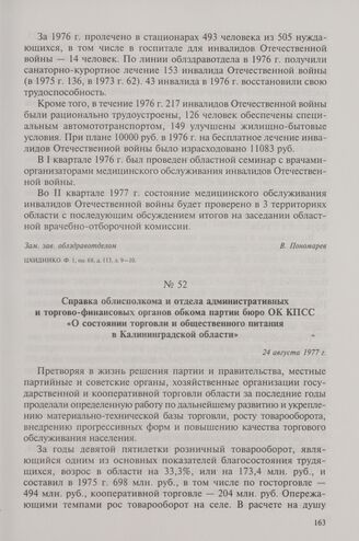 Справка облисполкома и отдела административных и торгово-финансовых органов обкома партии бюро OK КПСС «О состоянии торговли и общественного питания в Калининградской области». 24 августа 1977 г.
