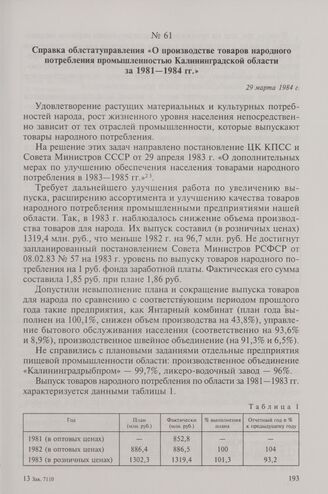 Справка облстатуправления «О производстве товаров народного потребления промышленностью Калининградской области за 1981-1984 гг.». 29 марта 1984 г. // ГАКО. Ф. 181, оп. 20, д. 257, л. 44-53.