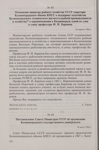 Постановление Совета Министров СССР об организации Калининградского государственного университета. 16 июля 1966 г. // СПП СССР. 1966. № 14, ст. 132, с. 284.